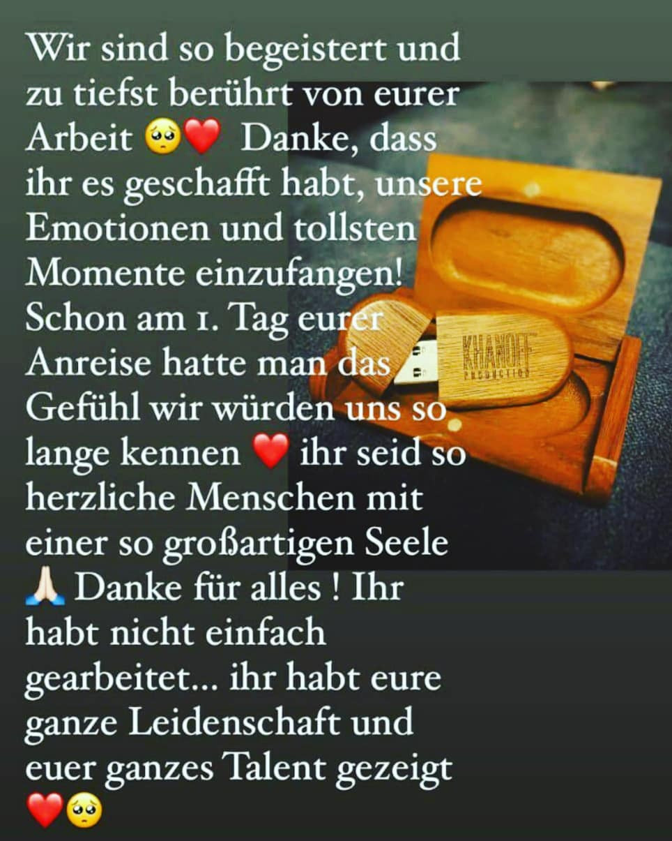 Wir sind so begeistert und zu tiefst berührt von eurer Arbeit 🥺❤️ Danke, dass ihr es geschafft habt, unsere Emotionen und tollsten Momente einzufangen! Schon am 1. Tag eurer Anreise hatte man das Gefühl wir würden uns so lange kennen ❤️ ihr seid so herzliche Menschen mit einer so großartigen Seele 🙏🏻 Danke für alles! Ihr habt nicht einfach gearbeitet… ihr habt eure ganze Leidenschaft und euer ganzes Talent gezeigt ❤️🥺